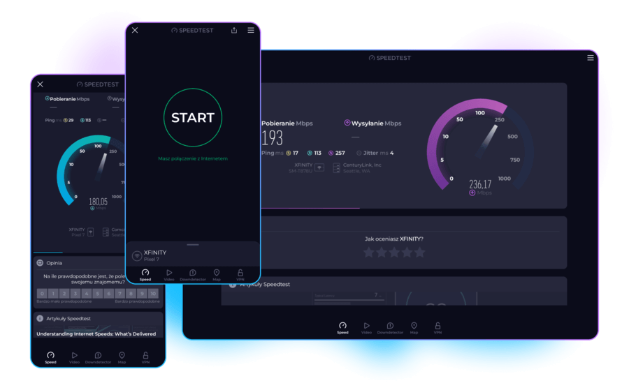 Naszą misją w Speedtest by Ookla® jest przyspieszenie internetu. W tym celu dostarczamy dane i badania na temat rzeczywistych prędkości internetu. Po przeprowadzeniu miliardów testów na całym świecie przedstawiamy Ci aplikacje na urządzenia, z których najczęściej korzystasz.